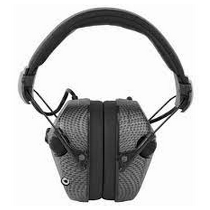 Birchwood Casey eKrest Electronic Muffs. NRR rating of 26dB. Attenuates all sound above 85dB. On/off switch with volume control for variable sound amplification. Auxiliary input jack with auxiliary cord included. Two omni-directional microphones. Includes 2 AAA batteries.