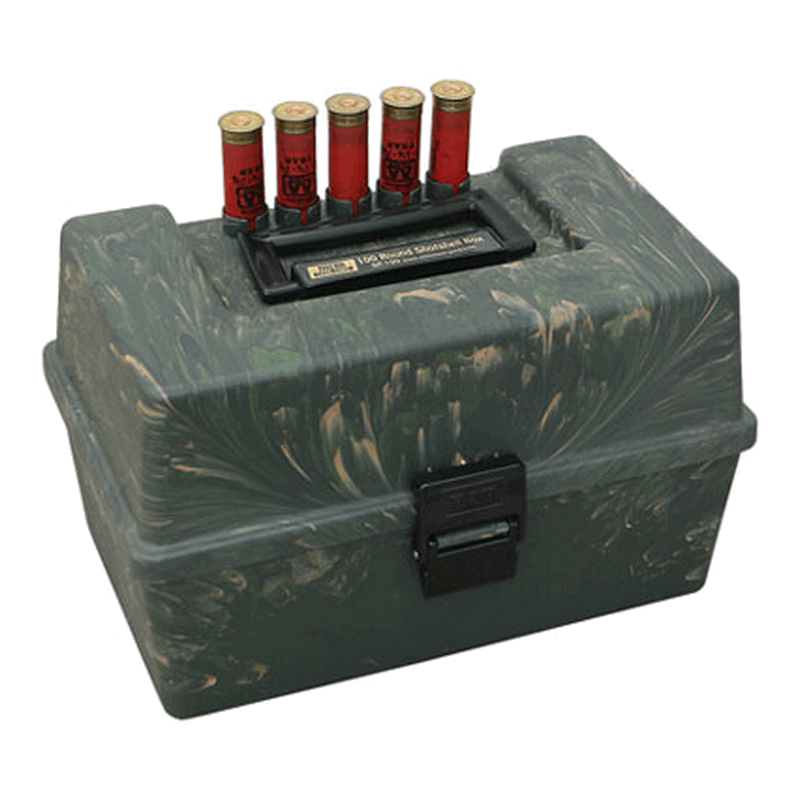 SF-100 Shotshell Box. Ideal for all duck, dove and goose hunting. Convenient for shotshell reloading. The SF-100 shotshell box holds 100 shotshells in two removable trays. The lid has five shell holders for quick access to cripple loads. Heavy duty fold down handle and latch. Hunting recommended usage chart included.