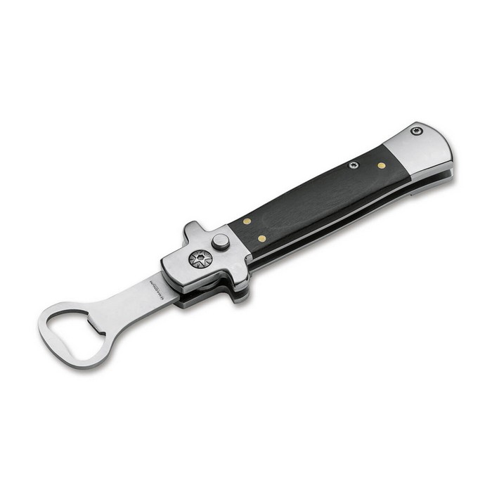 The Magnum Auto Wingman Bottle Opener is certainly one of the coolest tools for removing bottle caps. With the push of a button, the sturdy bottle opener snaps out of the pleasantly shaped handle with scales of dark Pakkawood. Without clip.