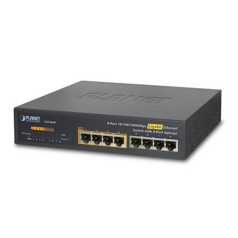 Planet 10" 8-Port 10/100/1000 Gigabit Ethernet Switch with 4-Port 802.3af PoE Injector (55W)