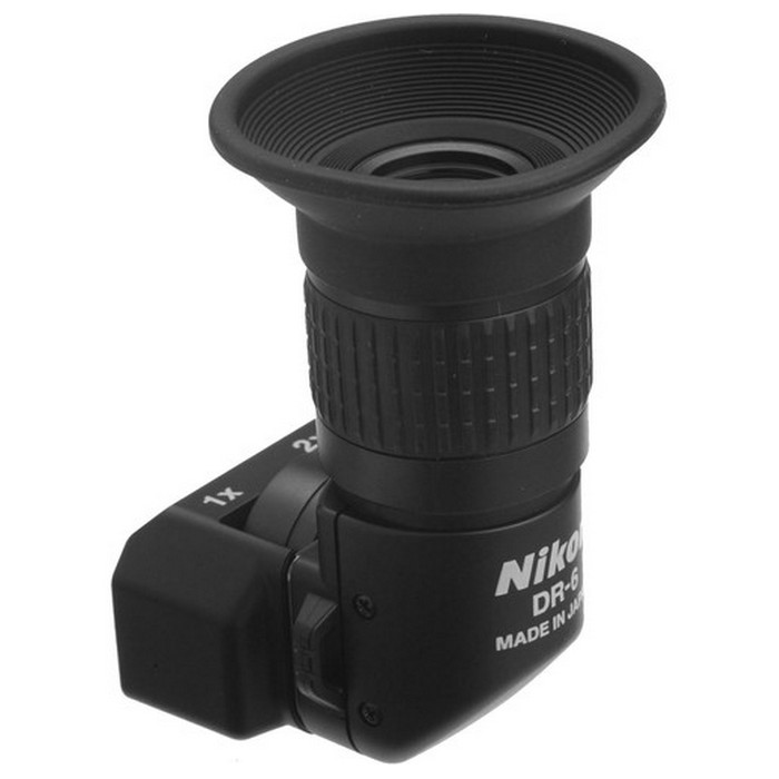 The Nikon DR-6 Rectangular Right Angle Viewfinder provides an upright, unreversed image for right-angle viewing, which is very convenient for waist-level or low-angle photography. Individual eyesight adjustment is possible with the built-in diopter, and the reproduction ratio can be set to 1:1 or 1:2. This version is designed to be mounted on SLR cameras featuring a rectangular viewfinder with a slip-on accessory slot.