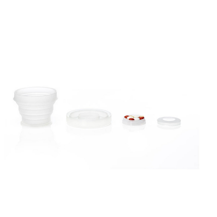 The 8 fl. oz. size features a clever “DoubleDecker” tray that gives you the option of two small chambers (to organize pills, for example) or one large chamber. The DoubleDecker also creates a handy portable pill box you can take on-the-go by itself. Volume markings on the cups help you measure fluids and enjoy fine spirits in moderation.