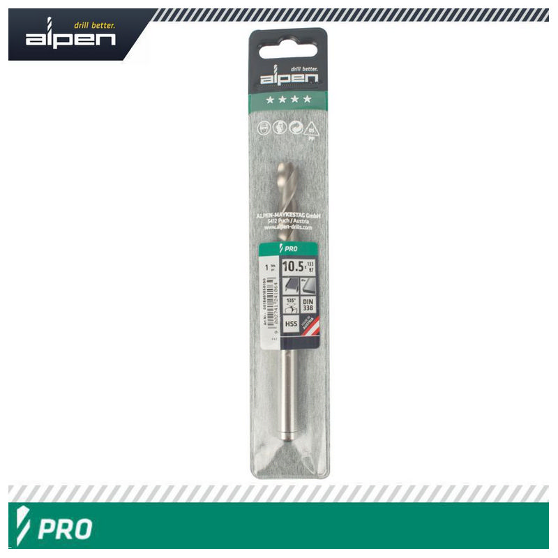 Alpen Pro HSS 10.5mm Drill Din 338 Rn 135 Split Point Plastic Wallet