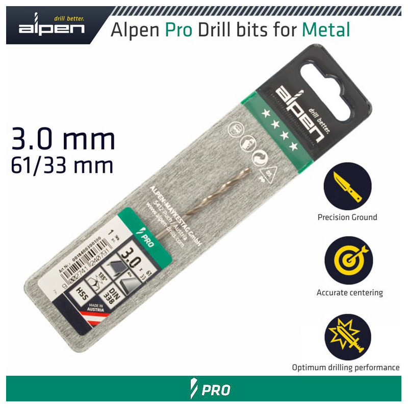 Alpen Pro HSS 3mm Drill Din 338 Rn 135 Split Point Plastic Wallet