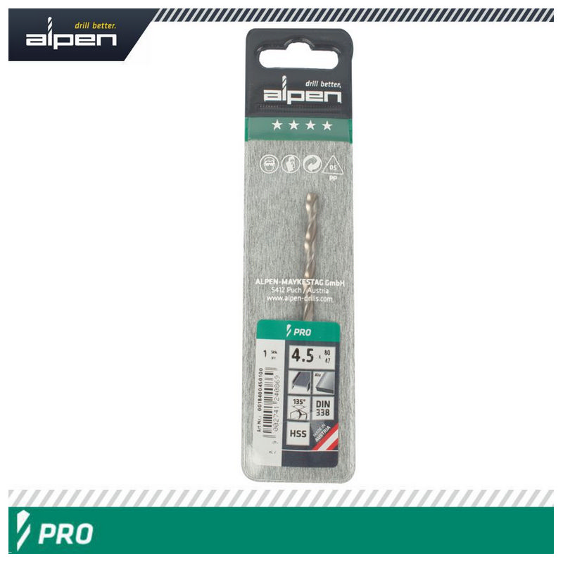 Alpen Pro HSS 4.5mm Drill Din 338 Rn 135 Split Point Plastic Wallet