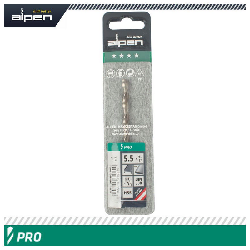 Alpen Pro HSS 5.5mm Drill Din 338 Rn 135 Split Point Plastic Wallet
