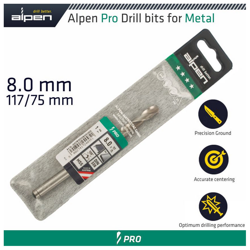 Alpen Pro HSS 8mm Drill Din 338 Rn 135 Split Point Plastic Wallet