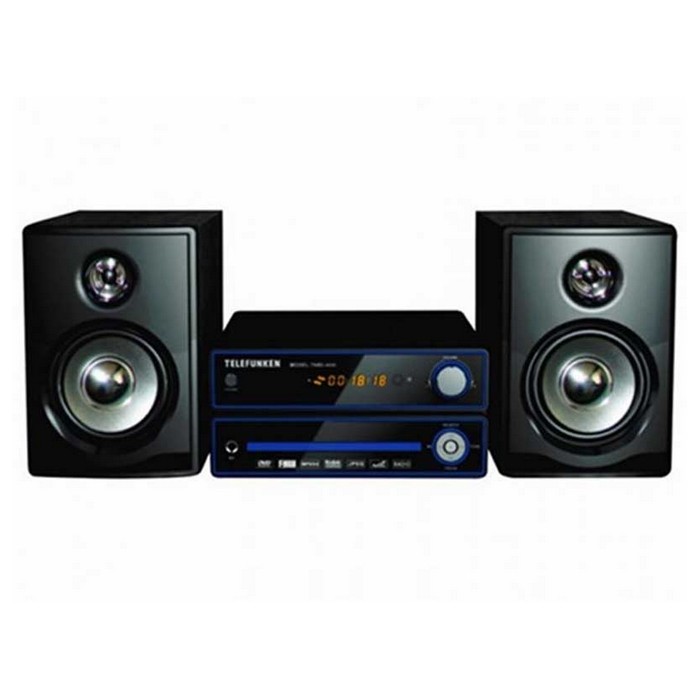 The Telefunken TMD-400C Micro DVD Hi-Fi System is a compact micro DVD hifi system with a modern design. It features two freestanding speakers which provide 15w RMS. It is compatible with DVD, CD, VCD, MP3, MPEG4, JPEG, CD-R+RW, DVD-R+RW, DTS and Kodak picture. It further offers AM and FM radio with automatic search functionality. It comes complete with a blue illumination light and full function remote control.