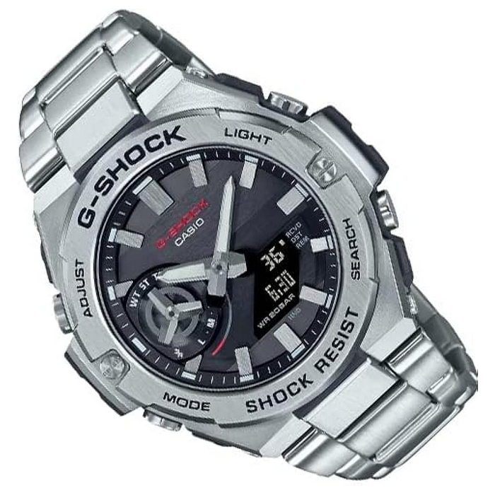The GST-B500 line brings together smaller components and high-density mounting, continuing to deliver Bluetooth connectivity and solar power charging, but in an even slimmer profile. The Carbon Core Guard absorbs external shocks for true G-STEEL toughness, and the comfortable fit complements your unique way of life. Downsized button guards offer slim yet ample buttons that are easy to operate.