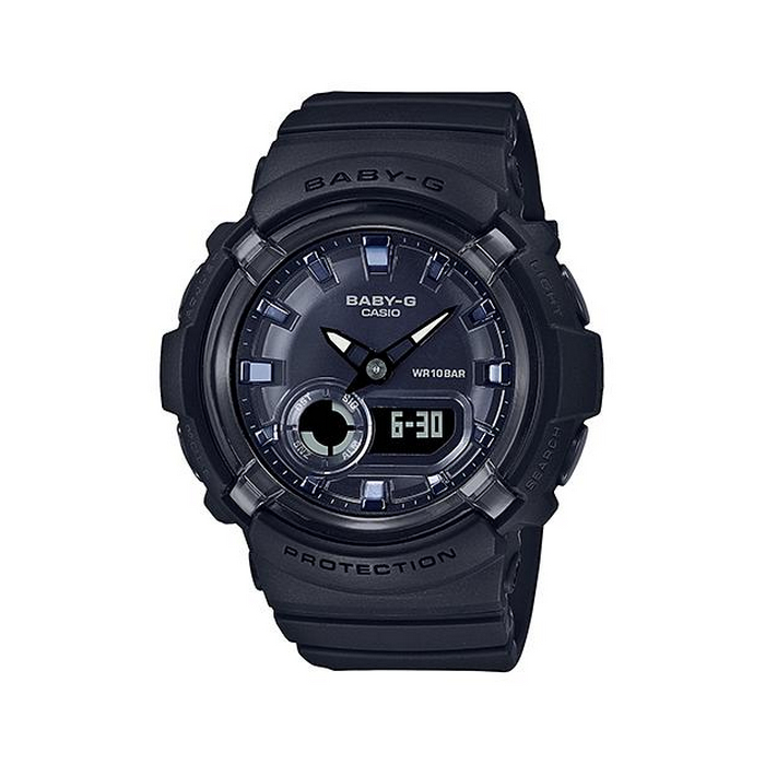 The BGA-280 Series layers multiple parts to create innovative and colorful designs. The round cases of these models and the cute impression of their hefty forms are complemented by the sporty touch of the metallic hour markers. The models in this series are available in a choice of three colors: black, coral pink, or white. The black model has a cool look, while the coral pink model is BABY-G cute. The face of the white model has a pastel tie-dye look, while the case combines white with grayish blue for a truly distinctive look.