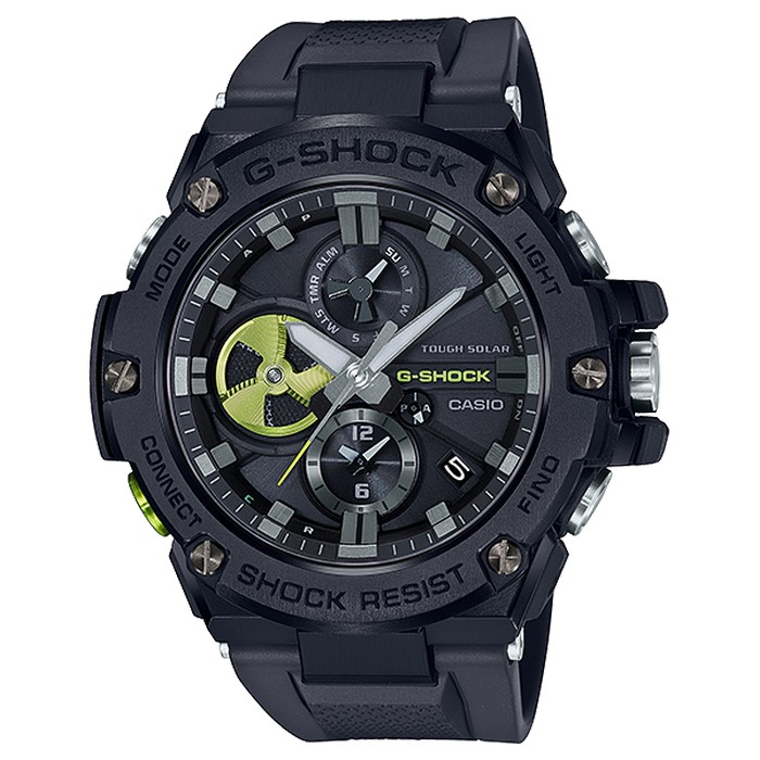 From G-SHOCK, the watch brand that is constantly setting new standards for timekeeping toughness, come new colors for the G-STEEL lineup that combines different materials. The Bluetooth® connect button, the GST-B100 iconic disk indicator at 9 o’clock, and the G-SHOCK logo are accented with colors that are typical of those seen on high-tech gadgets. The case has a black ion plated (IP) finish, which combines with the edgy GST-B100 design to create a pair of exciting new models.
