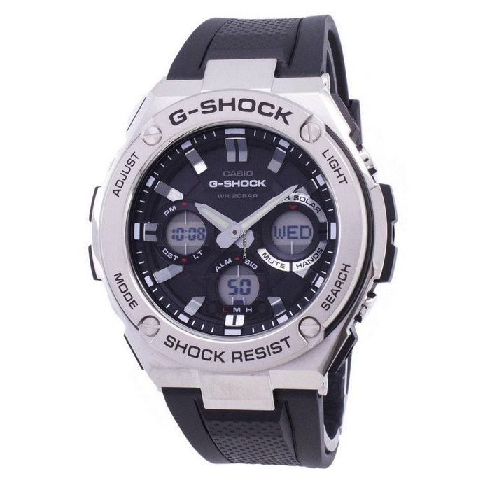 From G-SHOCK, the watch brand that is constantly setting new standards for timekeeping toughness, comes G-STEEL, a watch series with a new "layer guard structure". Different materials are used for the bezel to create a two-layer structure that adds a new dimension of shock resistant. For models that use stainless steel in the upper part, shock absorbing resin is employed in the lower part. If resin is used in the upper part, fine resin is used in the lower part to cushion against impact from the upper part. This also has made it possible create a wide range of different designs. The GST-S110 model expresses the hardness and beauty of metal. A hand shift feature temporarily moves hands out of the way with the press of a button for easy reading of digital display contents, while double LED face illumination keeps information easy to read at all times.