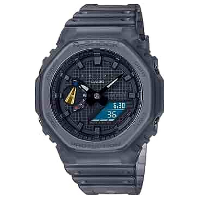This collaborative design begins with the GA-2100 and its octagonal bezel, incorporating translucent components to the base gray for a monochromatic, futuristic style. A gold indicator hand and the colors of the French flag (blue, white and red) adorn the small inset dial at 9 o’clock as striking accents.