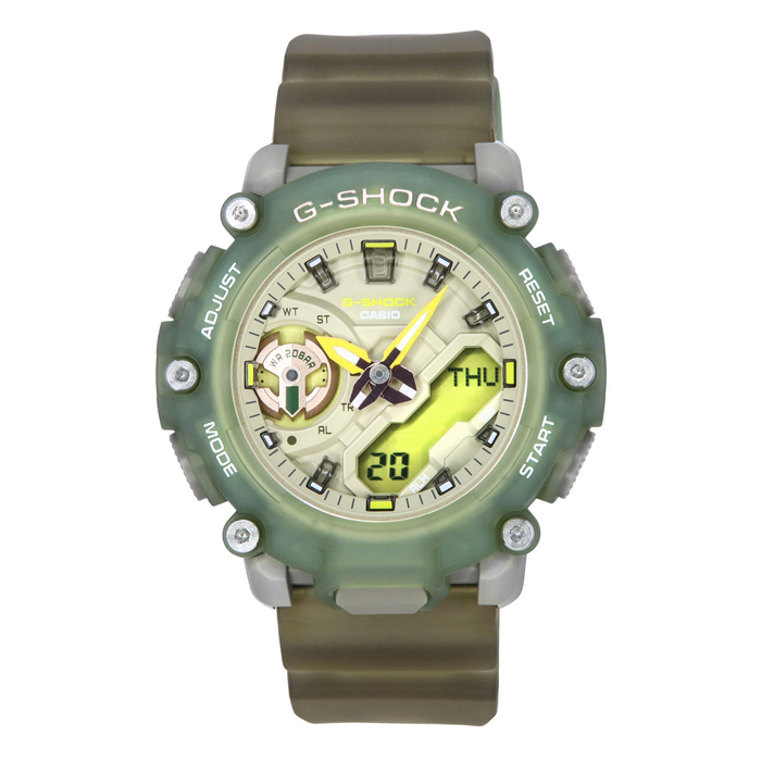 Get out and take in the fresh air with one of these GMA-S2200 designs featuring a casually colorful translucence. The index marks, band, bezel and band loop all feature different see-through colors that come together for a playfully expressive look.