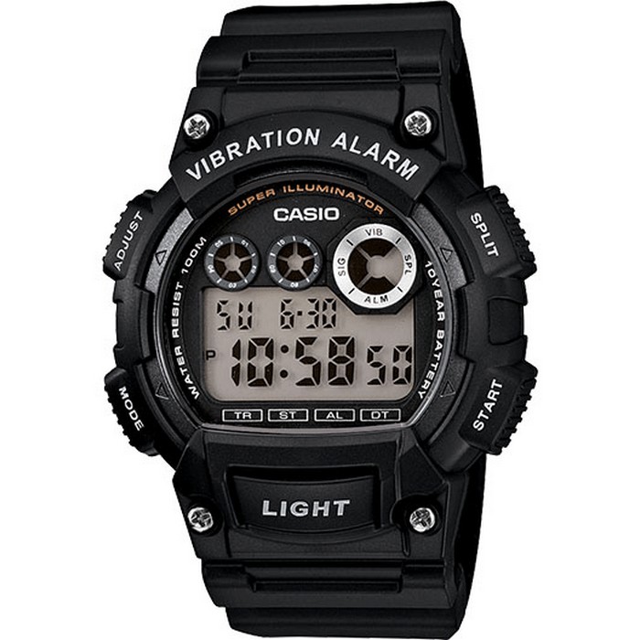 With the rugged looking W735 series, Casio re-introduces the vibration alarm, a function that is useful where discretion is required or in loud environments where audible alarm signals could be missed. The watch also includes a 10 year battery, is 100 meter water resistant and has a high-brightness LED light. All this and additional functionality provide a great value for those who work hard and play harder. Black resin band digital with neutral face.