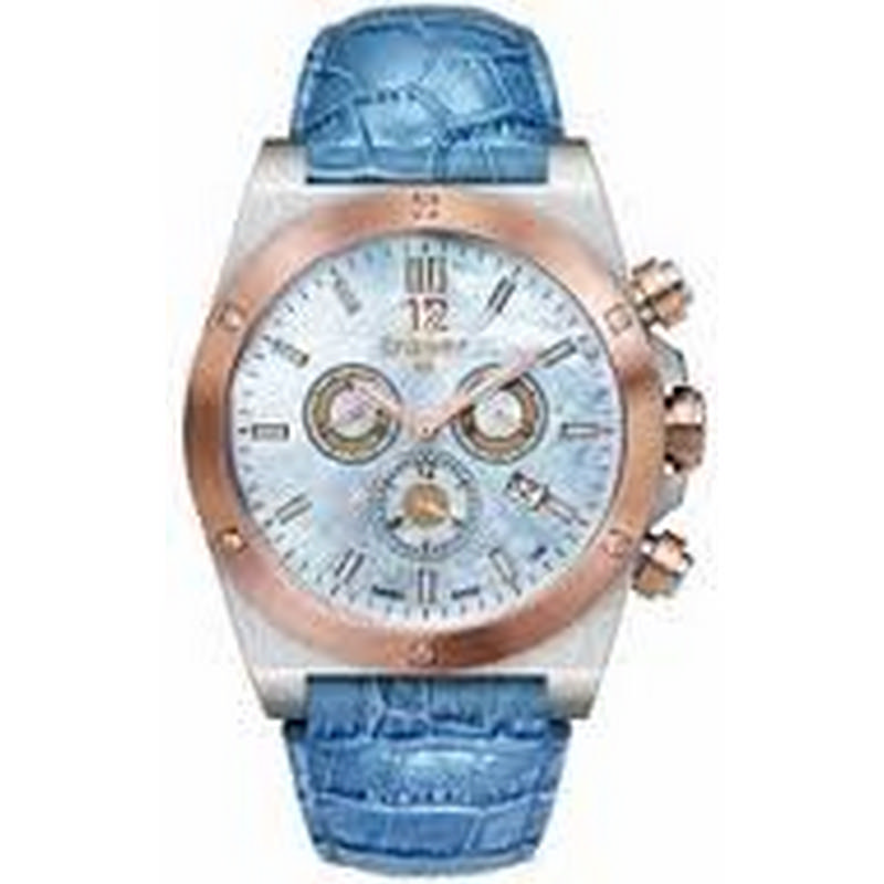Lady Blue Chronograph watch Leather. Type Quartz clockwork - batteries, stopwatch with an accuracy of 1.1 seconds, date dater luminescence hands and indexes trigalight, sapphire glass, Swarovski crystals fitting, waterproof 100, analog type, style, fashion, style, luxury, leather strap, steel housing - partly gilded color blue dial, round shape of the casing, color strap / pull blue, max. running time max. 12 hours, the other pearl dial.
