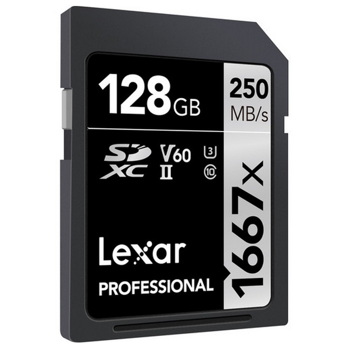 The Lexar Professional 1667x UHS-II SDXC Memory Card features a storage capacity of 128GB and takes advantage of the UHS-II bus to support advanced DSLR functions such as continuous shutter bursts and rapid shooting, as well as raw and JPEG captures. This card is also well-suited for video capture, including 4K, 3D, and Full HD video, and can achieve maximum read speeds of up to 250 MB/s. Thanks to its V60 speed class rating, minimum write speeds are guaranteed not to drop below 60 MB/s.