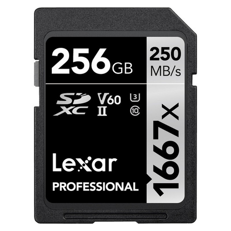 The Lexar Professional 1667x UHS-II SDXC Memory Card features a storage capacity of 256GB and takes advantage of the UHS-II bus to support advanced DSLR functions such as continuous shutter bursts and rapid shooting, as well as raw and JPEG captures. This card is also well-suited for video capture, including 4K, 3D, and Full HD video, and can achieve maximum read speeds of up to 250 MB/s. Thanks to its V60 speed class rating, minimum write speeds are guaranteed not to drop below 60 MB/s.