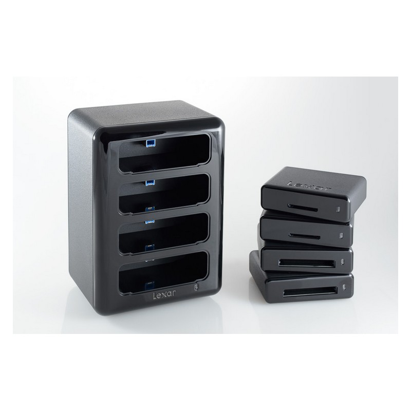 The Lexar Professional Workflow HR2 USB 3.0/Thunderbolt 2 Hub is a modular four-bay memory card reader hub accepts any combination of up to four Lexar Professional Workflow SDHC/SDXC UHS-I, CompactFlash UDMA 7, or XQD readers.