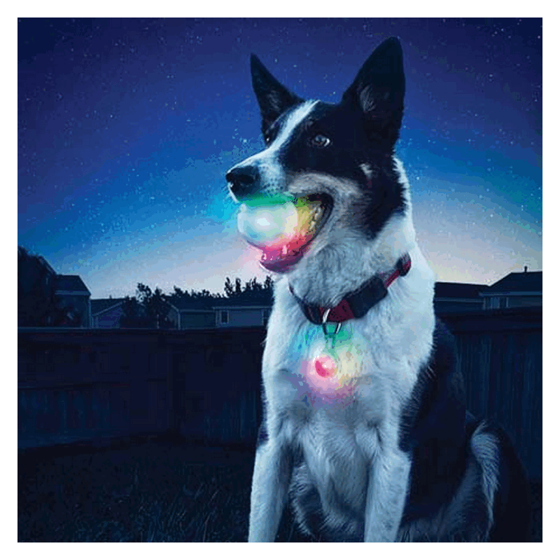 The GlowStreak LED Ball is the most technologically advanced nighttime fetch ball ever made, and holds up to the best arm or ball launchers around. This robust rubber ball has a protected inner core that contains an advanced motion-activated LED module with bright red or color-changing Disc-O LEDs, and it turns on with a simple bounce. It also features an auto shut-off function after ten minutes without a bounce (5 minutes of glow followed by 5 minutes of flashing), giving you or your dog time to find it if one of you becomes distracted. The molded, shockproof, removable polycarbonate core houses the LED/battery module and screws securely into place creating a waterproof seal. The same size as a tennis ball and invincible to water or slobber, this tough little ball floats, and is great for the dog who loves to swim. The unique grooved design on the surface creates a bite friendly exterior that is easy to pick up for small and large dogs alike, making it the perfect fetch toy for your four legged friends of all sizes. Powered by replaceable, long-lasting batteries, you can have up to 35 hours of playtime with the GlowStreak.