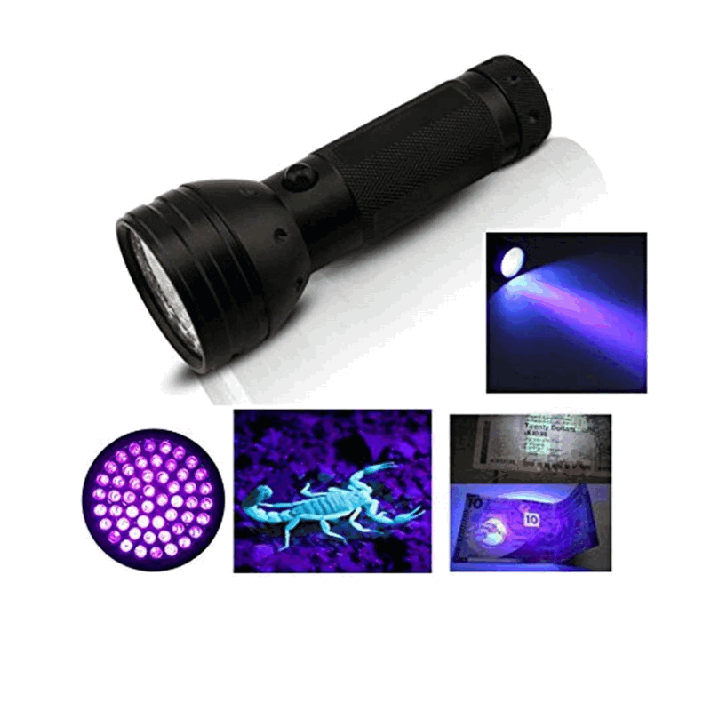 Light weight Palm Sized Torch with Beveled Edge for Striking with. Designed to detect Scorpions, under UV light scorpions will glow brightly. Can also be utilised for checking bank notes, detecting leaks or stains, inspecting antiques, viewing forensics and fluorescent ink.