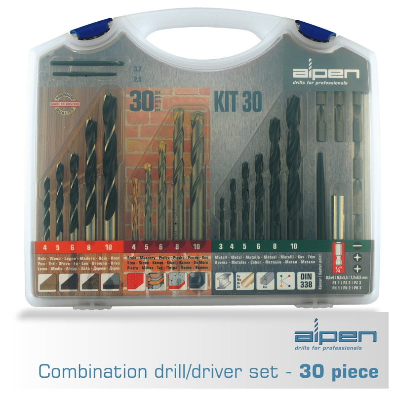 Alpen multipurpose drill bit and screwdriver set in a handy plastic carry case. Versitile and handy for a quick job on the jobsite