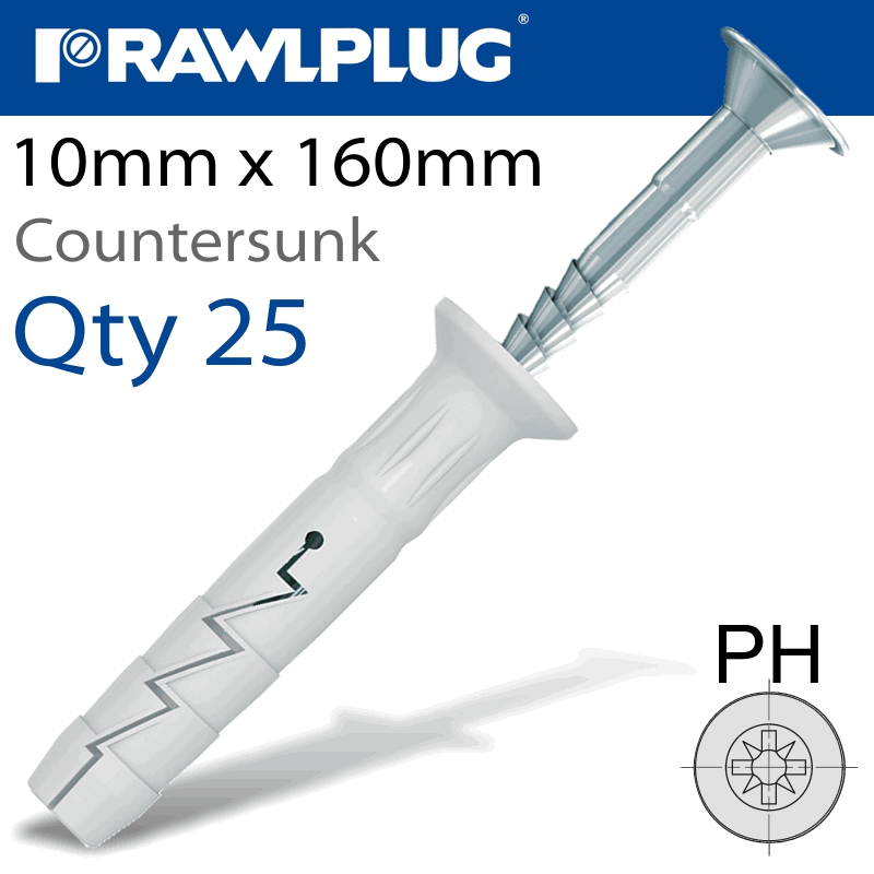RAWLPLUG Nyl Hammer-In Fixing 10X160Mm + Csk Head X25 -Box