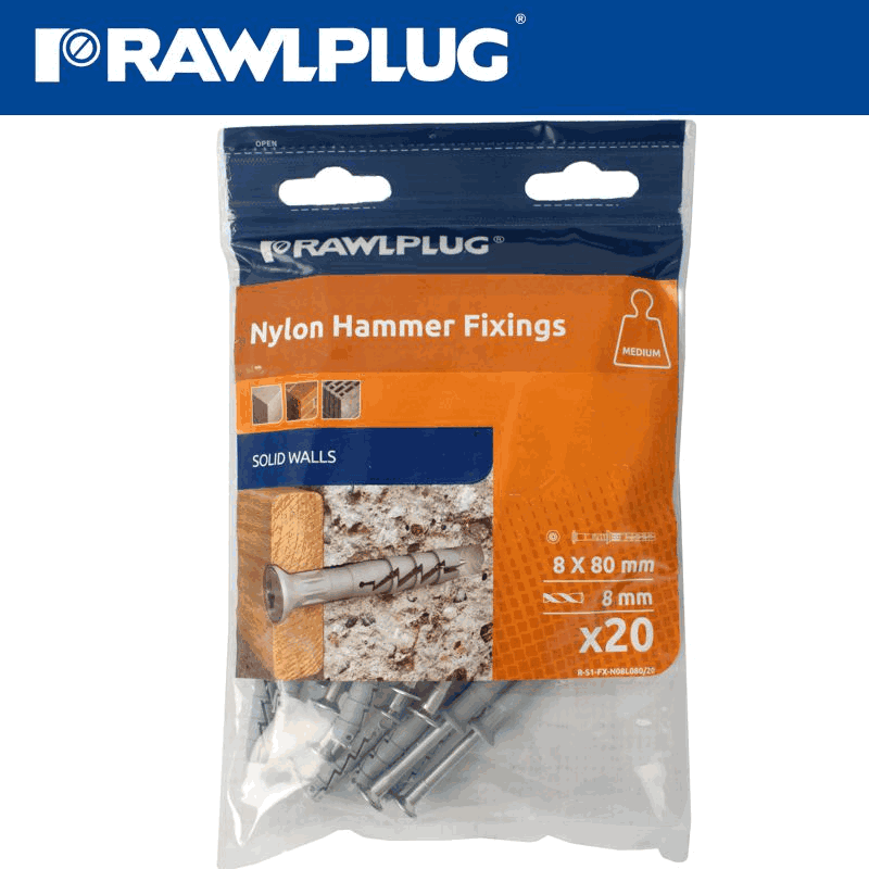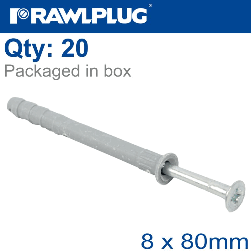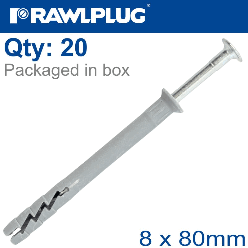 RAWLPLUG Nyl Hammer-In Fixing 8X80Mm + Csk Head X20 -Bag