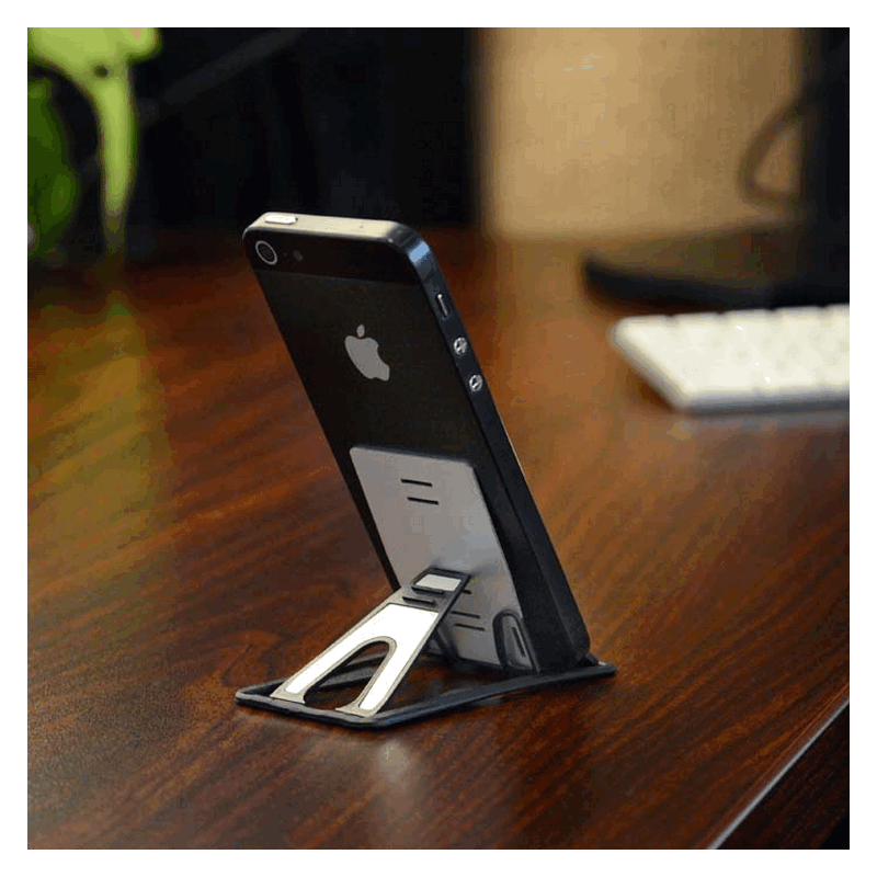 The QuikStand was designed to eliminate the use of randomly assorted books, coffee mugs, and cereal boxes to prop up our valuable smartphones and tablets, and also do away with the unreliable support they provided. Made with sleek brushed aluminum and sturdy, yet flexible polypropylene, the QuikStand can be adjusted to different angles, and holds your device securely in either portrait or landscape orientation. In its resting state, it's about the size of a credit card and easily fits in your wallet. To use, simply unsnap the aluminum back support out of the polypropylene base, then, raise the adjustable aluminum support bar to the desired position and slide your device between it and the front flap - it fits smartphones and 7" tablets with or without cases. The easy portability of the QuikStand makes it great for travel (it's especially excellent for use on long plane rides), and perfect for reading recipes, video chatting, browsing the internet, or catching up with the news - wherever you are.