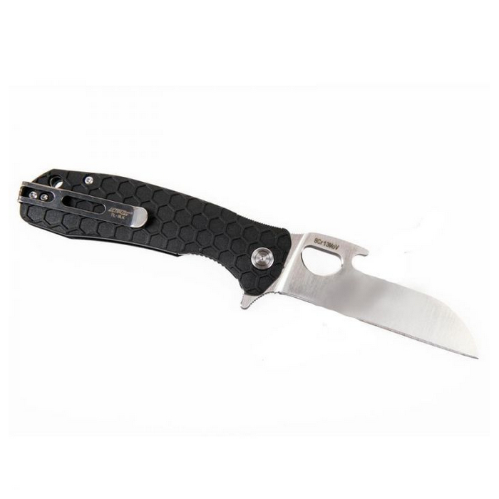 The Honey Badger Small Black Tong Knife is a light weight and balanced knife that offers a frictionless opening and closing action. It was designed to be tough and features handle slabs, choils as well as blade spines that contact the hands in use and provides a firm grip even if wet.