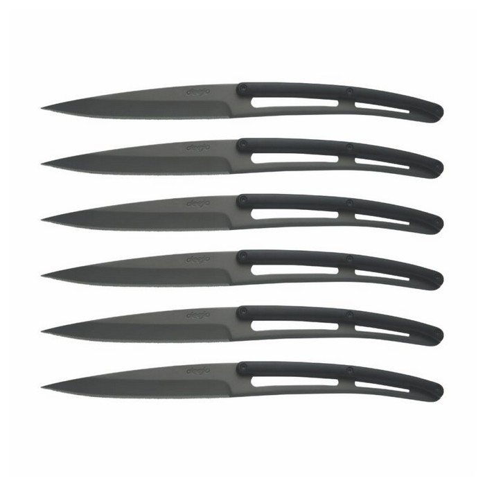 Set of six table knives with a fixed serrated blade (non-folding) in 420 stainless steel with a mirror finish. The handle is plated on both sides with black ABS. 100% dishwasher safe.