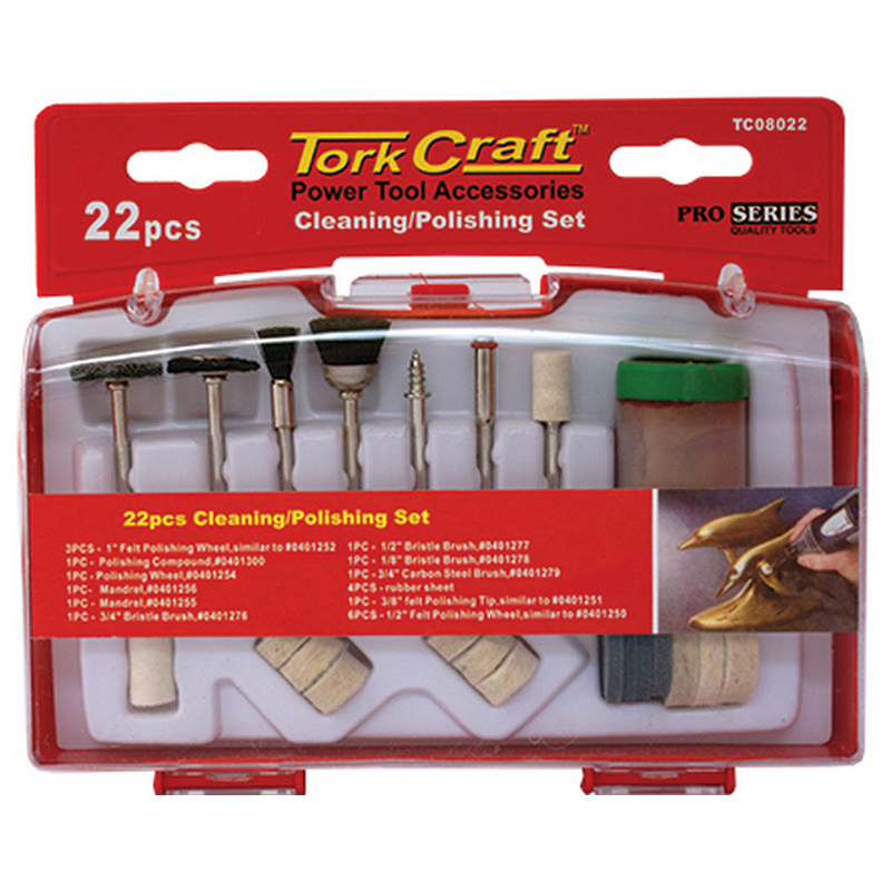 The set includes a total of 22 cleaning and polishing mini tools that can be used with any Tork Craft rotary mini tools.