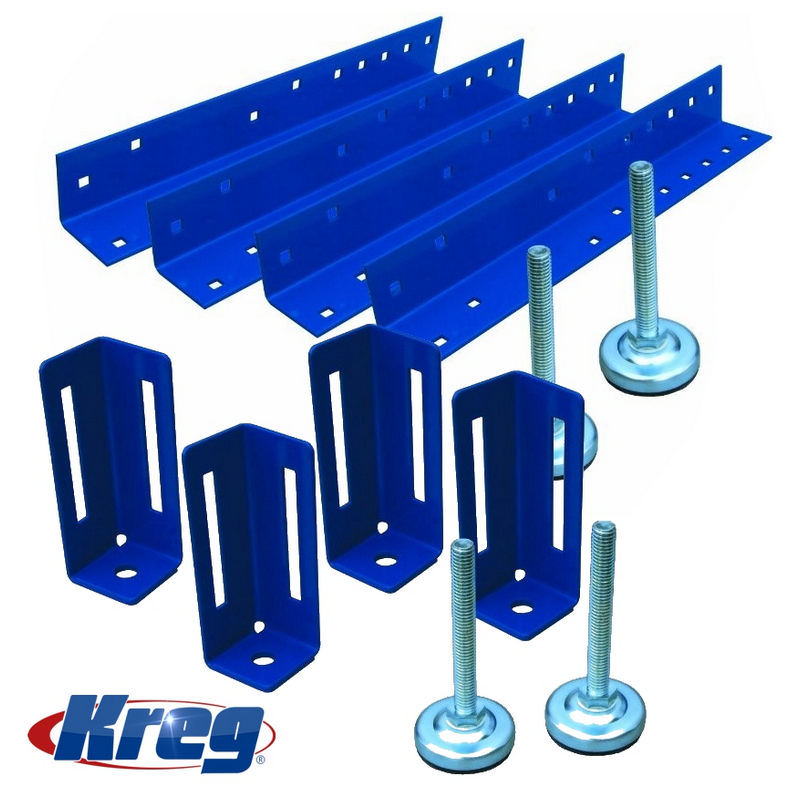 Includes: 4 legs, 4 leg levelers, 4 adjustable feet, Kreg logo sticker, and assembly hardware.