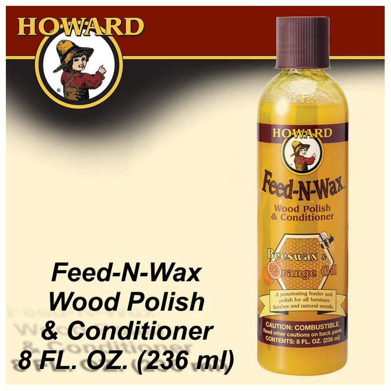 Use Howard Feed-N-Wax to prevent drying and cracking while preserving the wood finish. Feed-N-Wax is a special blend of beeswax, carnauba wax, and orange oil. It enhances the natural beauty and depth of grain in finished and unfinished wood, especially oak.
