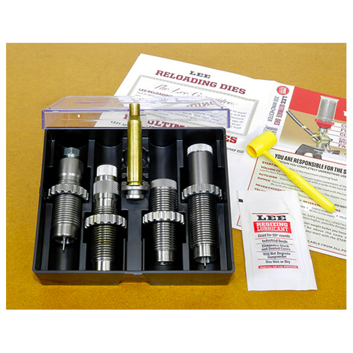 30/30 Ultimate Rifle 4-Die Set. Choose this die set for maximum versatility. The set features a full length-resizing die to return brass to factory new dimensions, perfect for reloading brass fired in other guns. The Collet Necksizing die is used on your fire formed brass giving you best possible accuracy. No case lube required when using the Collet Necksizing die and cases last almost forever. The Easy Adjust Dead Length Bullet seating die foolproofs the bullet seating adjustment, and assures perfect seating depth every time. The Factory Crimp die provides a secure crimp on bullets with or without a crimp groove. In most cases it helps accuracy by providing a uniform higher start pressure and gives the finished cartridge Factory like accuracy and dependability. The set is complete, with shell holder, powder measure and famous Lee load data featuring all common brands of powder organized in a easy to read logical format.