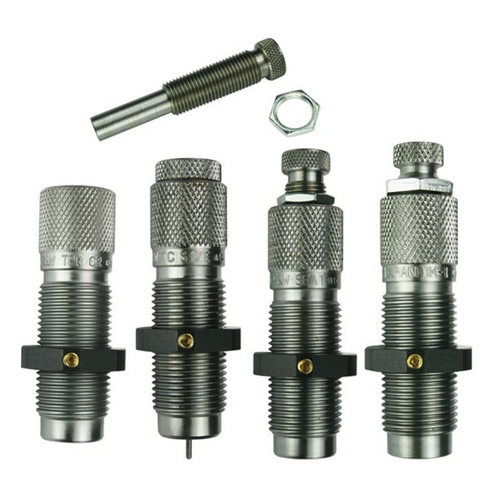 The 4-Die Sets feature a separate taper crimp die and two-step neck expander M die. The M die improves the accuracy of case and jacketed bullets. Like standard expander button styles, the M die doesn't stretch the case. Working in a two step process, the first step expands the inside of the case neck to just under the bullet diameter. The second step expands the case mouth to bullet diameter or slightly over so that the bullet can be started perfectly centered.