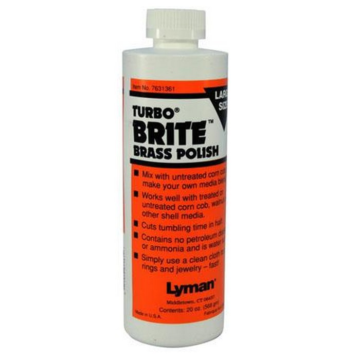 The Lyman Turbo Brite Brass Case Polish (20 oz) is ideal for use as an additive when using untreated corn cob or walnut hull media. Turbo Brite also works with treated media to bring brass to a high luster shine. To activate media use 1 tablespoon per pound of media. This formula may also be used with treated media and works well with both corncob and walnut hull media.