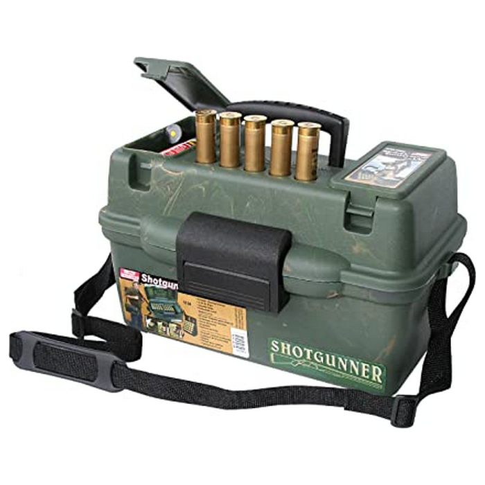 • Four removable, 25 round shotshell trays; Outside lid compartments; Five cripple load holders; Shoulder strap