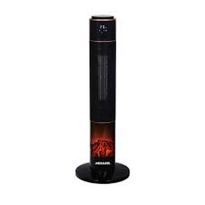 Goldair PTC fan heater with fire display. 8 hour timer settings with tip-over switch. Remote control.