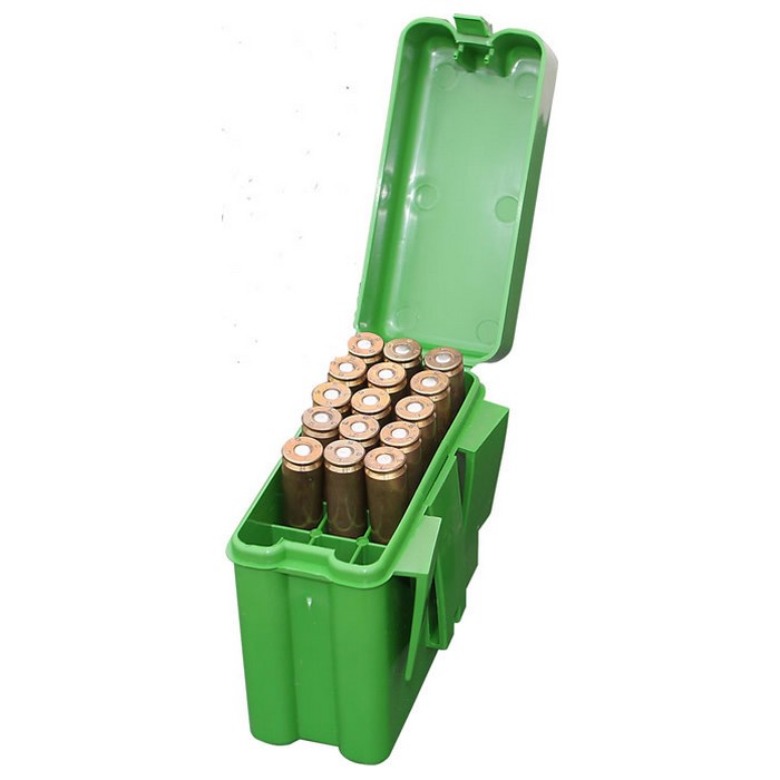 Worn on the belt, this CASE-GARD ammo carrier puts twenty rounds at the hunter's fingertips. Each cartridge fits into its own recess, bullet down for easy removal. Two special ribs protect the bullet from touching the bottom of the case to guard against tip damage (which can change the flight characteristics of a bullet). Not only will your ammo be protected from dust and moisture, but the MTM Snap-Lok latch will prevent accidental openings. The calibers listed below will provide bullet tip protection with very little rattle; however, calibers not listed will fit loosely.