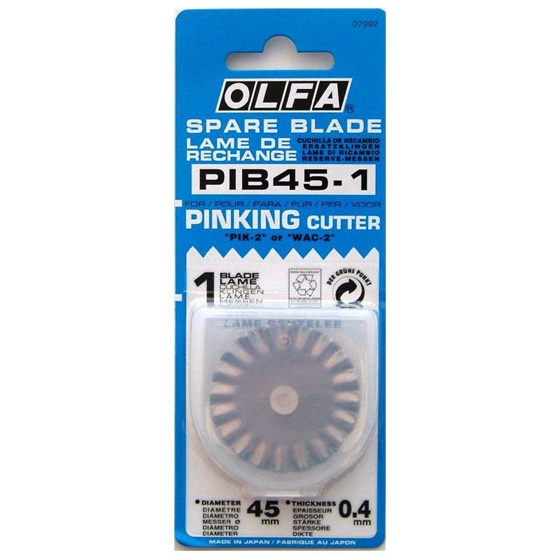 If you want to keep the edge of your fabric from raveling, you need to cut it with a pinking blade. This OLFA® blade puts those familiar 'teeth' on the edge of the fabric, for a look that's both decorative and functional. For use only with the OLFA® 45mm deluxe rotary cutter (RTY-2/DX). (PIB45-1, #9456US)