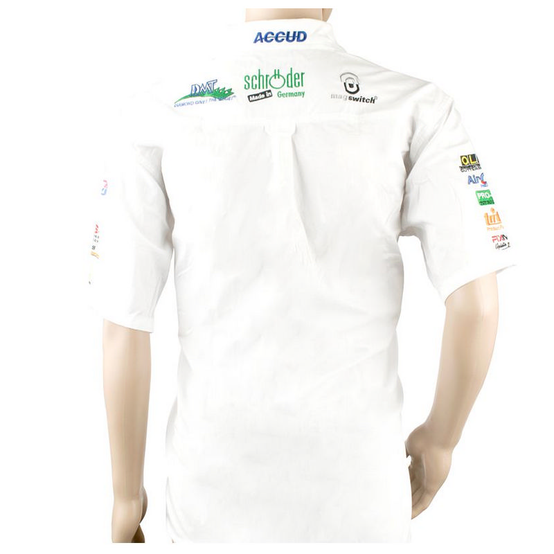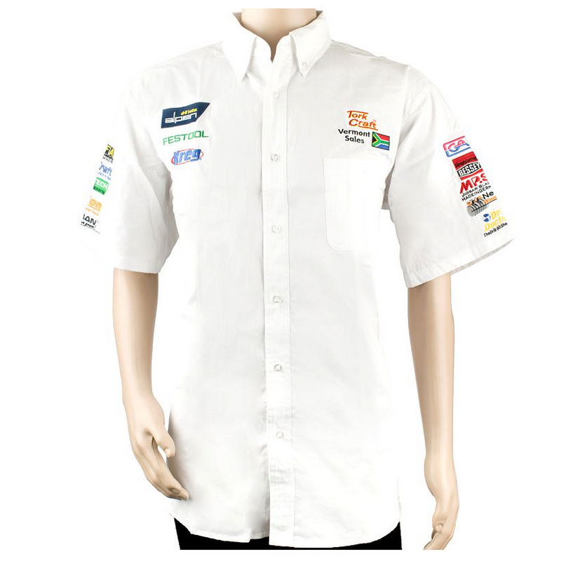 The shirt represents the Vermont Sales company. The leading brands are embroidered on the sleeves and the chest.