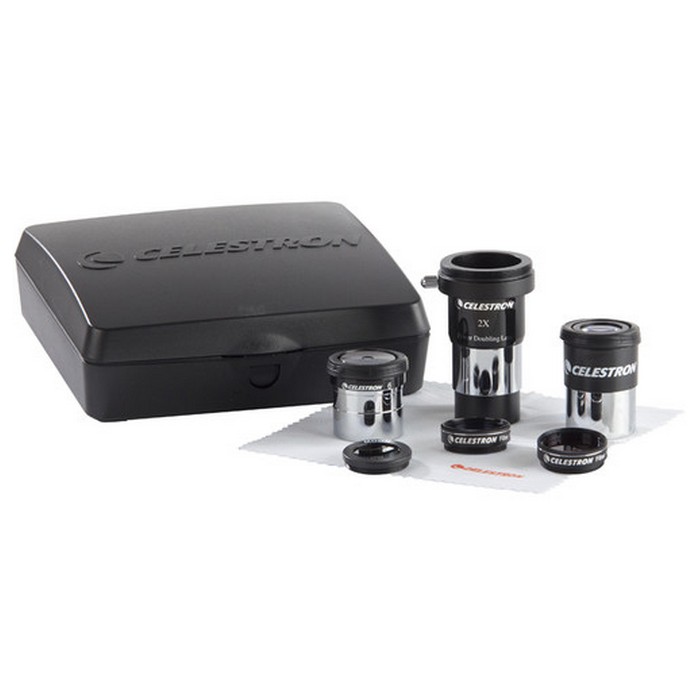 The 1.25" AstroMaster Accessory Kit from Celestron features a selection of useful additions to your kit that will enhance your observational experiences. The two eyepieces produce medium and high magnifications in most telescopes, and the Barlow lens doubles the magnification of any eyepiece used with it - essentially doubling your inventory of eyepieces. Two of the most popular colored planetary filters, Red and Blue, can be used to enhance and highlight specific areas on Jupiter, Saturn, Mars, Mercury, Venus, and Saturn, as well as comets. For safe viewing of our closest celestial object, a Moon filter is also included with reduces glare and enhances contrast on the surface. To hold all these accessories is a hard plastic case with a custom-cut foam lining.