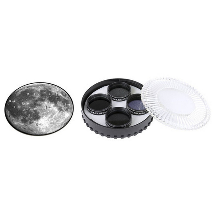 Celestron assembled the Moon Filter Set to give you the right tools for safely enjoying perfect views of the lunar surface during all of its phases. Each of the three neutral density filters offers different degrees of transmission that you can use to match different moon phases. A fourth Moon & Sky Glow filter provides high-contrast views of the lunar surface and enhances observation of deep-sky objects from light-polluted skies. The aluminum filter cells are threaded on both sides so the filters will fit most standard 1.25" eyepieces, eyepiece imagers, and accessories and are stackable with other filters for a customized viewing experience. Emphasizing its purpose, the set includes a plastic carrying case with a moon map and legend for identifying the most popular lunar features.