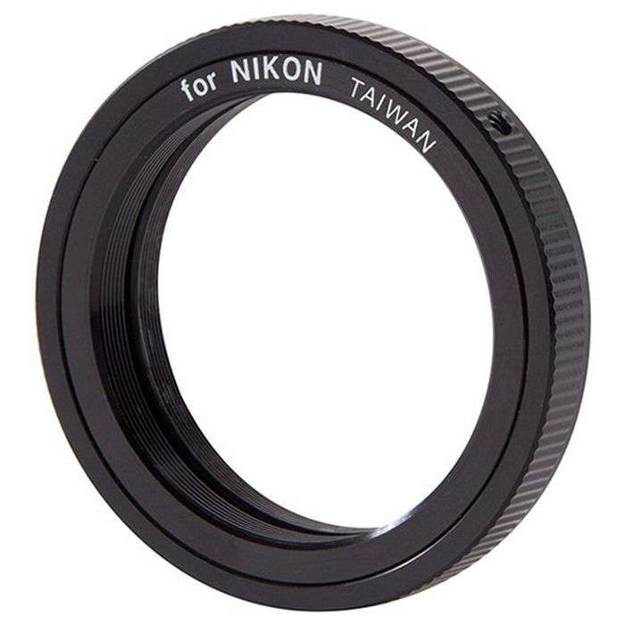 The T-ring is made of black-anodized aluminum. The internal surfaces are blackened and glare-threaded to provide the highest contrast. The T-ring has a ribbed surface that allows you to securely grip it when threading or unthreading the ring. The T-ring should be used with compact DSLR/mirrorless type cameras only. Larger cameras would be too big to attach to your telescope.