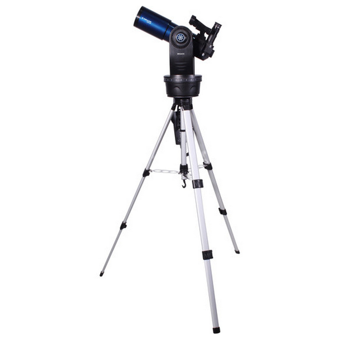 With the ETX80 Observer 80mm f/5 Achromat Refractor GoTo Telescope, Meade gives you a complete computer-controlled motorized observation rig, including the means to safely store and carry your gear. The achromat optical design corrects spherical and chromatic aberrations to produce crisp and clear high-contrast images with true color rendition across its entire distortion-free field of view. For those who want to use it for astrophotography, an internal mirror flips down to direct the optical path straight back for prime-focus photography using a DSLR camera body and optional adapters. The upper eyepiece holder has an integrated 2x Barlow lens that will effectively double the magnification of any eyepiece put in it.