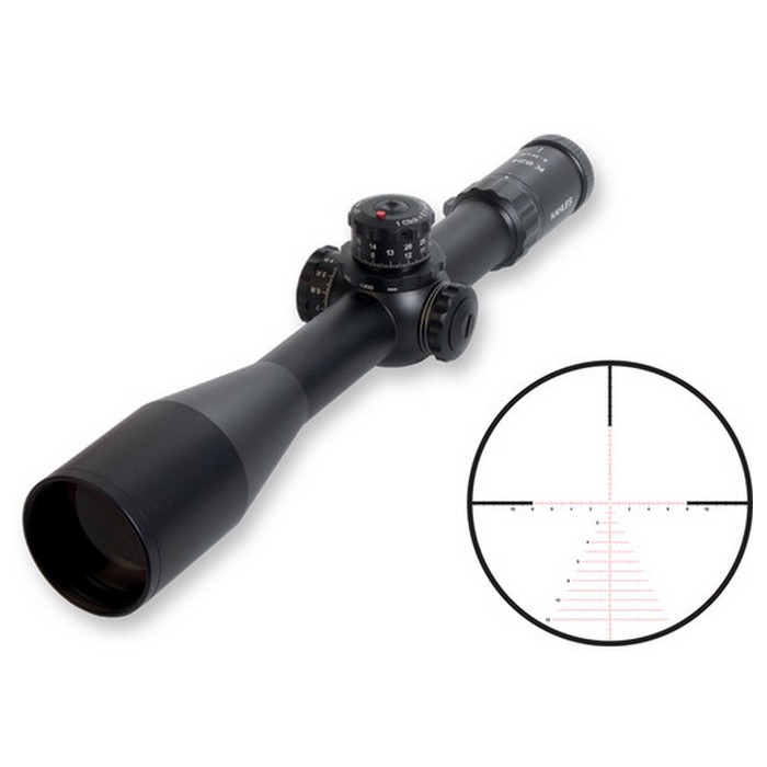 The 1st focal plane SKMR3 illuminated reticle features three posts in the upper half of the field and a fully illuminated crosshair. The crosshair is defined by fine milling marks and a system of horizontal lines cascading down from the center point. The reticle gives accurate range, ballistic, and wind compensations at all magnifications and has an inclination-based Automaticlight illumination. This produces a bright red glow when the scope is canted below a 45° angle, instantly turns off the illumination when the scope is canted at an angle above 75°, and provides a two-minute waiting period before turning off the illumination when the inclination angle is between 45 and 75°.