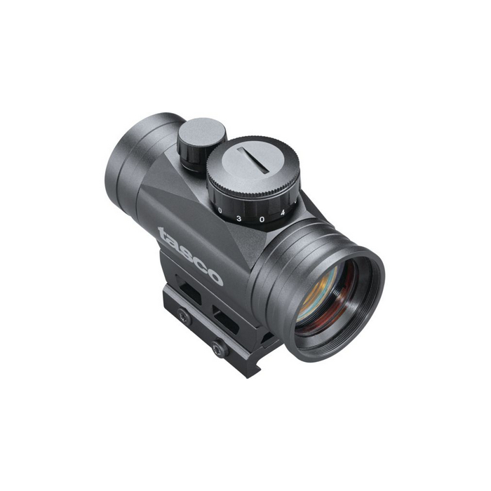 The Tasco 1x 30mm 3 MOA Red Dot Sight with Hi/Lo Mount is for use on firearms equipped with Weaver style or Picatinny accessory rails. It has a 5,000 hour battery life on mid-setting, and has an illumination intensity control with alternating off positions to make it easier to turn on to the user's preferred brightness. It features a battery, basic mounting tools, and an optional hi-rise mount for use on modern sporting rifles and has a removable sunshade.